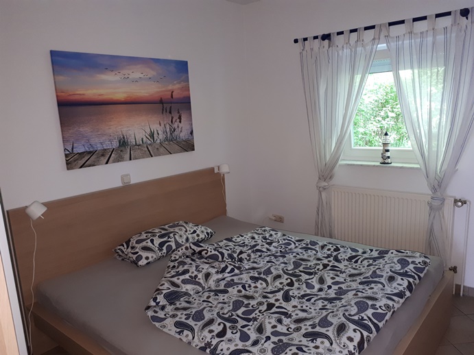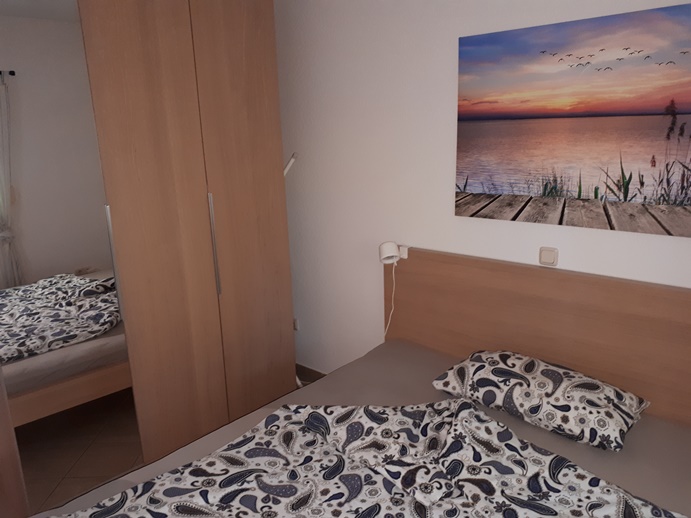 Von dort aus gelangen Sie auf die ruhig gelegene, teils überdachte Terrasse, die mit Sitzmöbeln, einem Gartentisch und zwei Liegen aufwartet. Neben dem Küchenbereich liegt, mit Zugang vom Wohnbereich aus, das gemütliche Schlafzimmer mit Doppelbett (1,9 m x 2,0 m) und großem Schrank mit Spiegeltür.