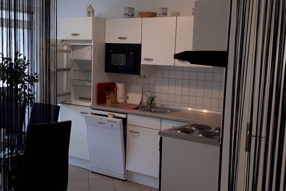 Vom Wohnraum aus gelangen Sie direkt in die offene, vollständig ausgestattete Küche (Backofen, Mikrowelle, Geschirrspüler, etc.) mit Sitzmöglichkeiten für max. 5 Personen.