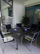 Das Wohnzimmer mit Blick auf den Innenhof ist mit Couch, Sessel, Couchtisch sowie einem Flachbildfernseher (bei Bedarf drei zusätzlichen Schrankbetten) ausgestattet.